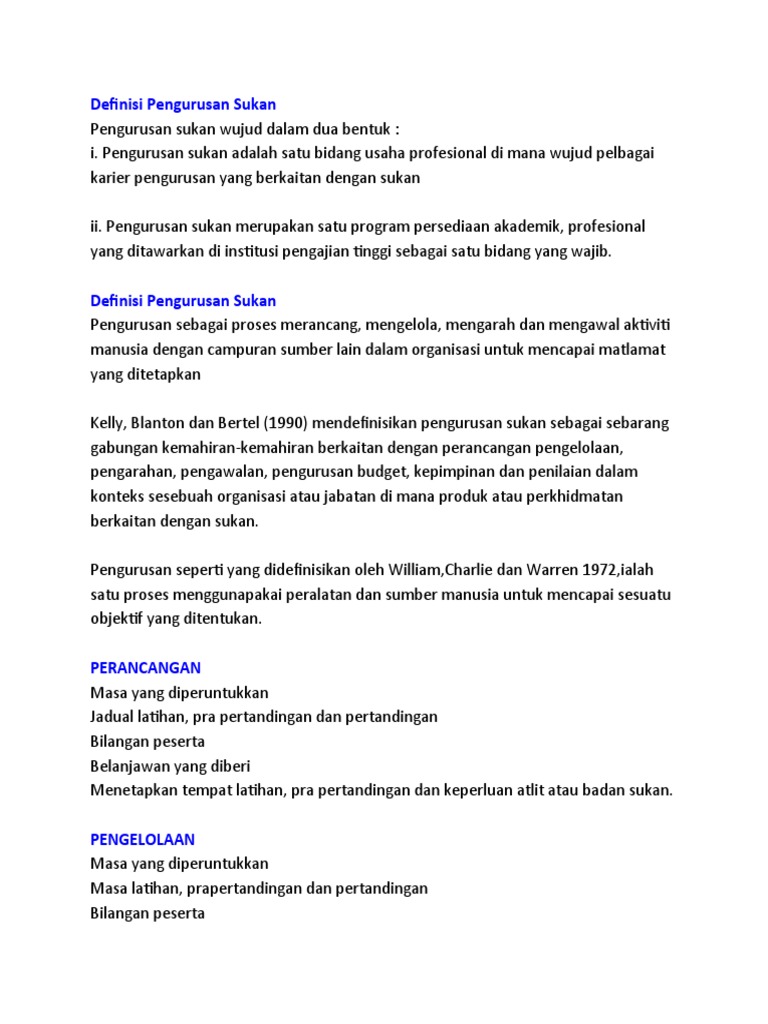 Pengurusan acara sukan isi kandungan definisi acara3 kebaikan keburukan penganjuran acara terhadap ekonomi negara. Pengurusan sukan wujud dalam dua bentuk. Definisi Pengurusan Sukan Kelly Blanton dan Bertel 1990 mendefinisikan pengurusan sukan sebagai Sebarang gabungan kemahiran kemahiran berkaitan dengan perancangan pengelolaan pengarahan pengawalan pengurusan bajet kepemimpinan dan penilaian dalam kontek sesebuah organisasi atau jabatan di mana produk atau perkhidmatan.